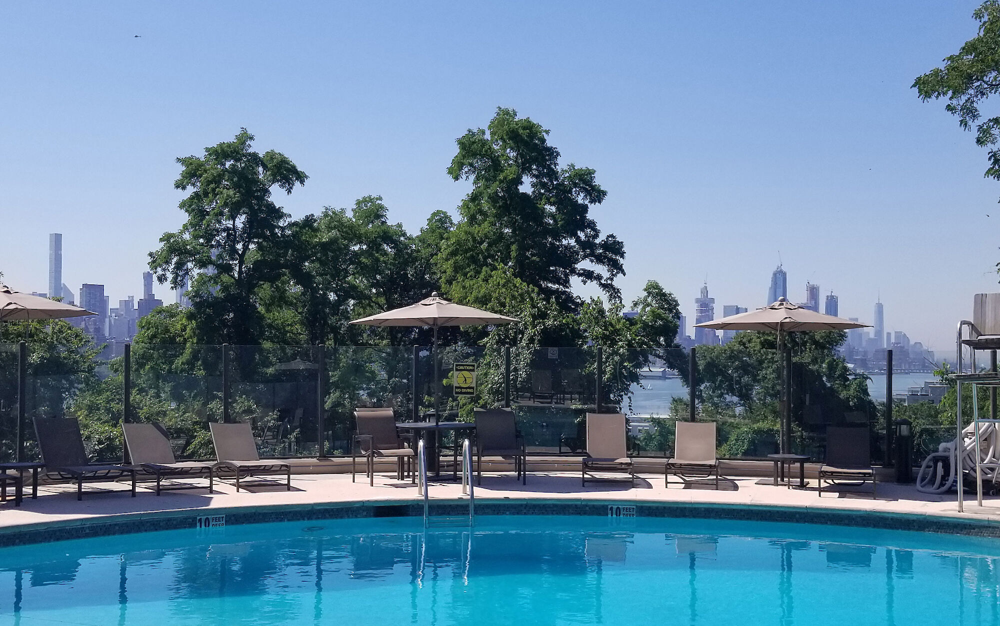 Also experience the outdoor swimming pool and landscaped deck overlooking the Manhattan skyline.
