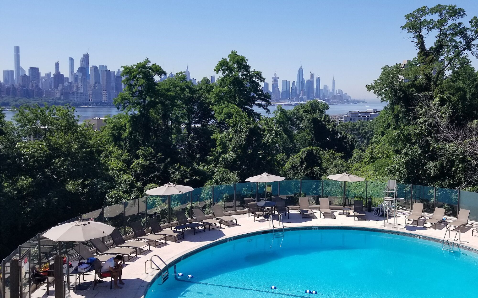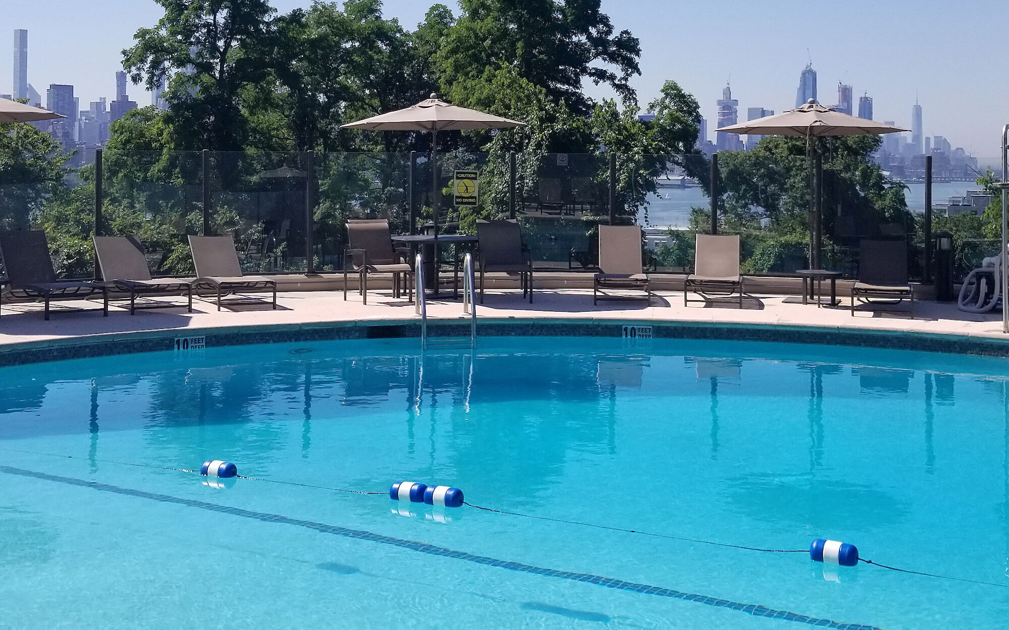 The exclusive facility has an outdoor swimming pool and landscaped deck that overlooks the scenic Manhattan skyline.
